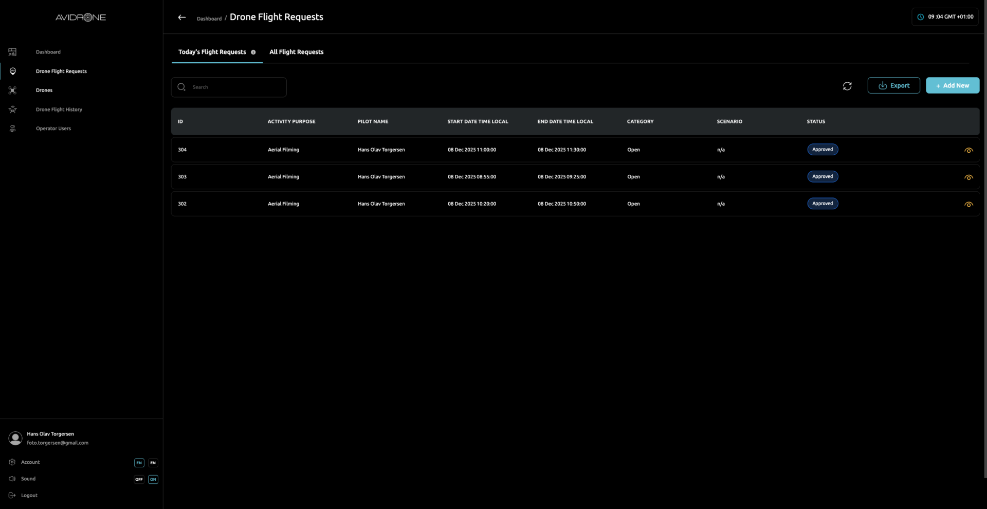 Slik ser listen over våre innmeldte flighter ut. FOTO: Skjermdump Avidrone