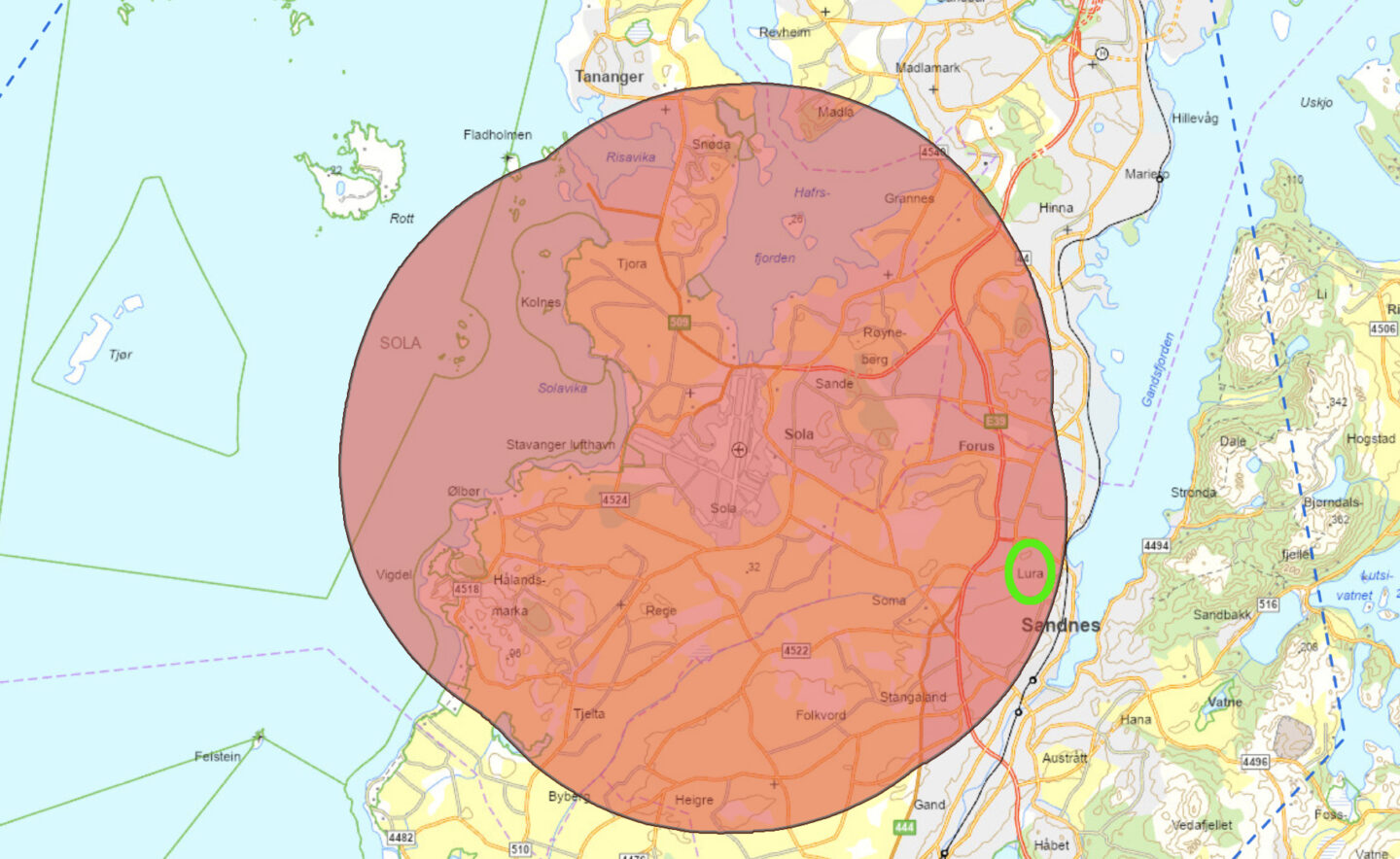 Lura ligger øst for Stavanger lufthavn Sola, en av landets travleste flyplasser, og innenfor fem kilometers-sonen der det ikke er lov å fly drone uten etter tillatelse fra tårnet.