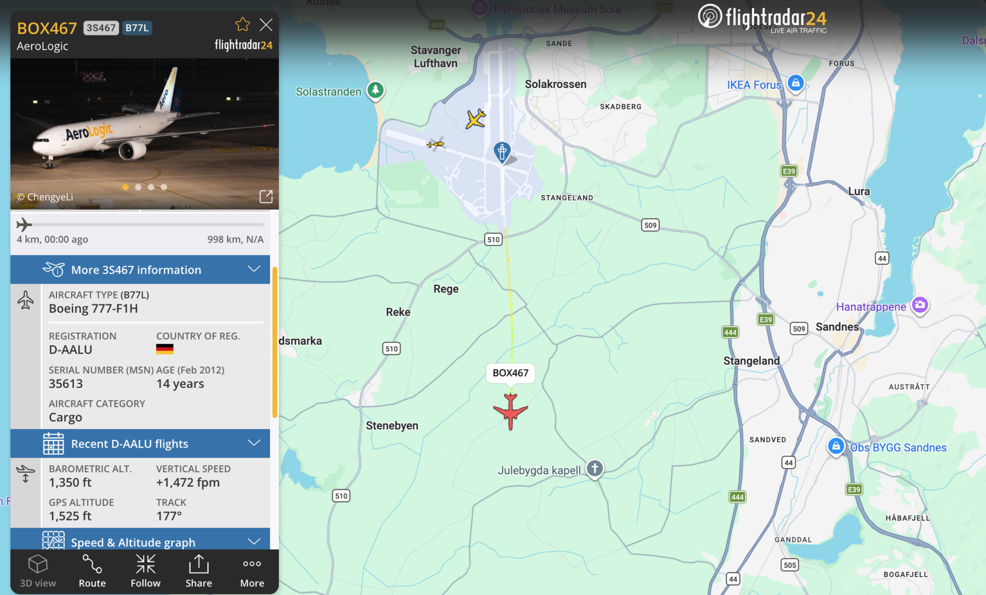 Dette frakteflyet som tok av fra Sola lørdag kveld hadde en høyde på 1350 fot da det hadde samme avstand til rullebanen som stedet der de to mindreårige fløy drone i over 1100 fots høyde. FOTO: Skjermfoto/Flightradar24