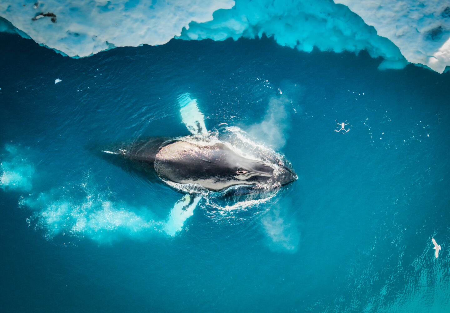 Dronen som han hadde med seg bruker han vanligvis til å mappe isbreer, men kameraet kan også brukes til andre motiver, slik som knølhvaler.