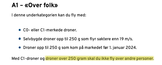 Det betyr at setter du et av batteriene du har fra en gammel Mini inn i den nye, vil vekten plutselig være over 260 gram. Da er du ikke lenger i C0, men må forholde deg til noe strengere regler som blant annet gjør at du ikke kan fly over personer som ikke er involvert i operasjonen din.