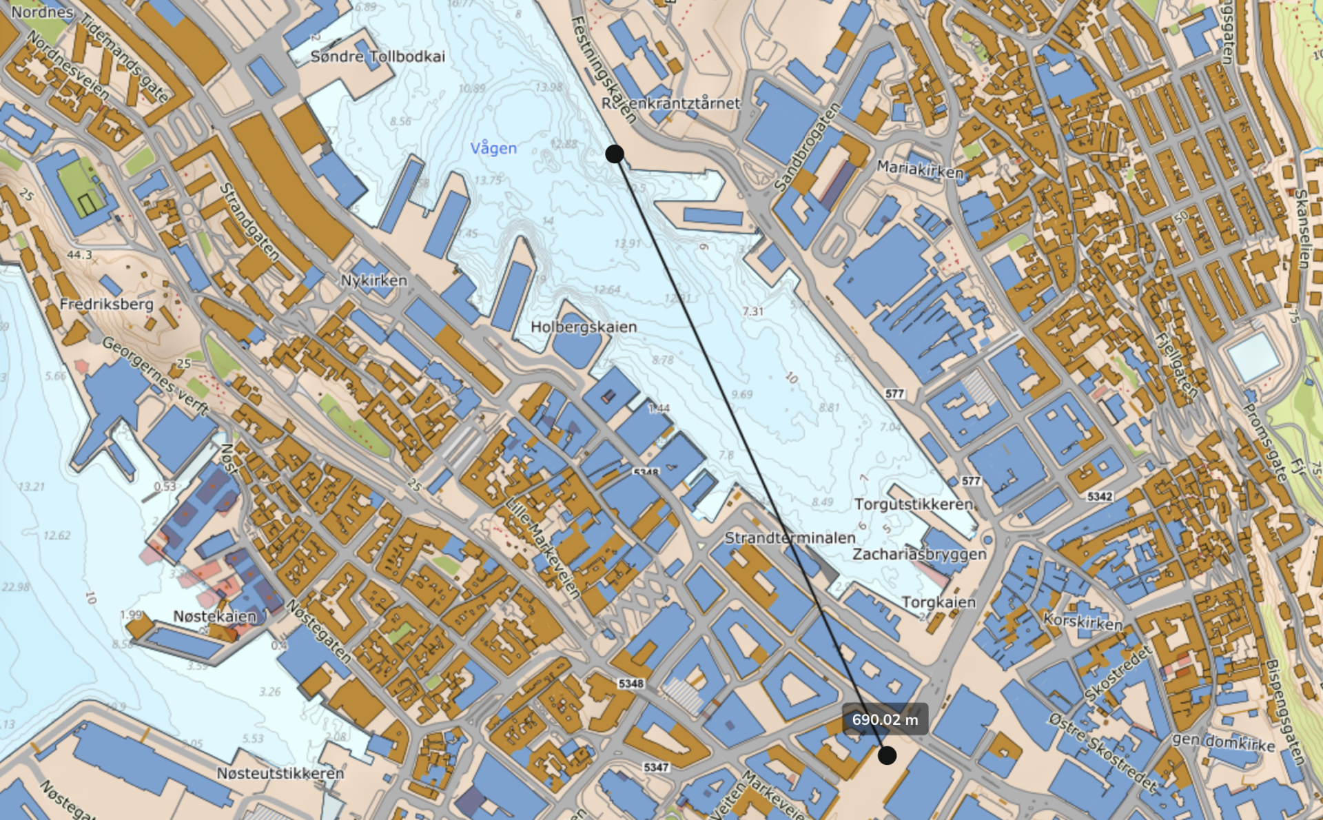 Yrkessjåføren fløy dronen sin fra Torgalmenningen, nesten 700 meter fra det tyske marinefartøyet, og sier til Dronemagasinet at han hadde fri sikt og øyekontakt med dronen hele tiden. FOTO: Skjermfoto/Norgeskart.no.