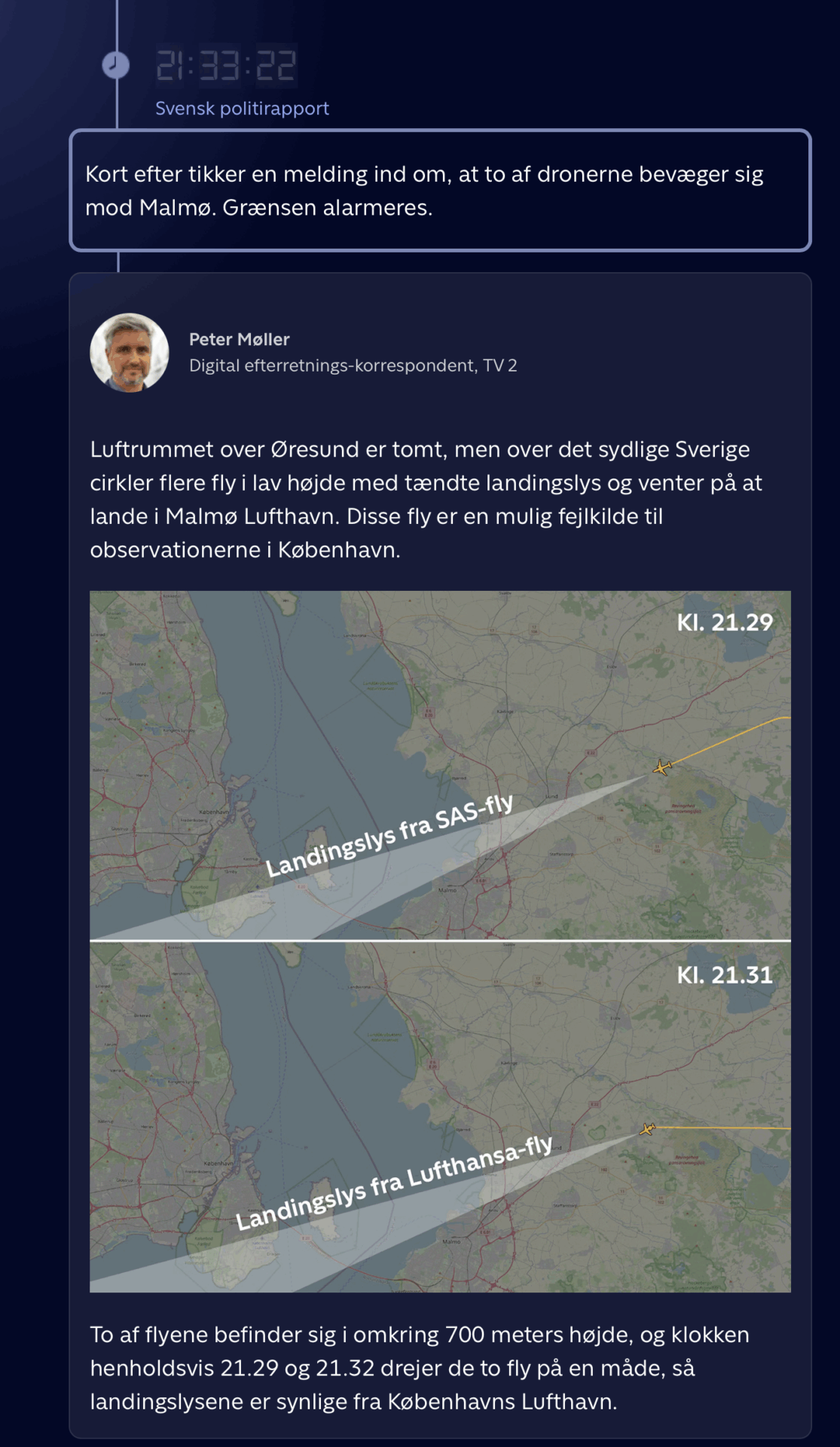 Etter å ha fått innsyn i den svenske politirapporten fra den kvelden, der 11 patruljer deltok i jakten, konkluderer TV 2s egne journalister og flere eksperter med at det langt på vei kan ha vært lys fra fly som ble forvekslet med droner.