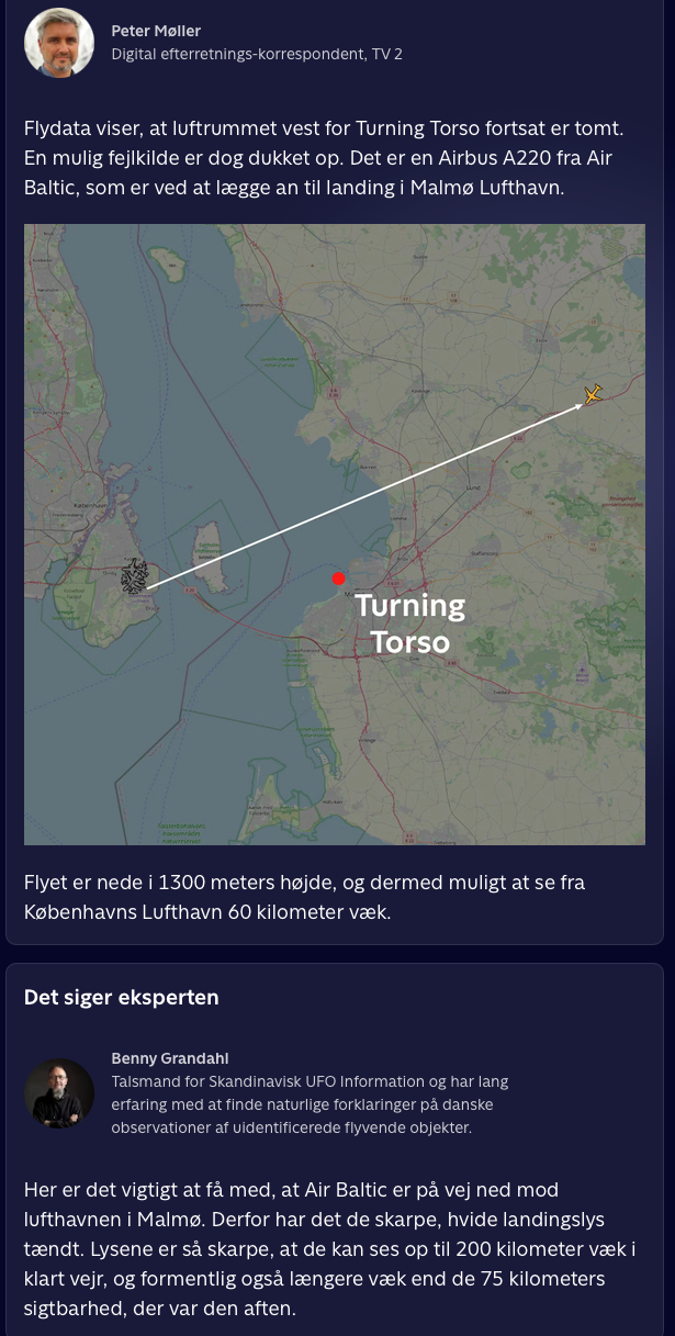 Skarpe landingslys på et fly kan ses opptil 200 kilometer unna sier eksperten Benny Grandahl til Danske TV2. Det kan være mulige feilkilder sier Petter Møller, digital etteretnings-korrespondent i TV2. Foto: Skjermdump Danske TV2