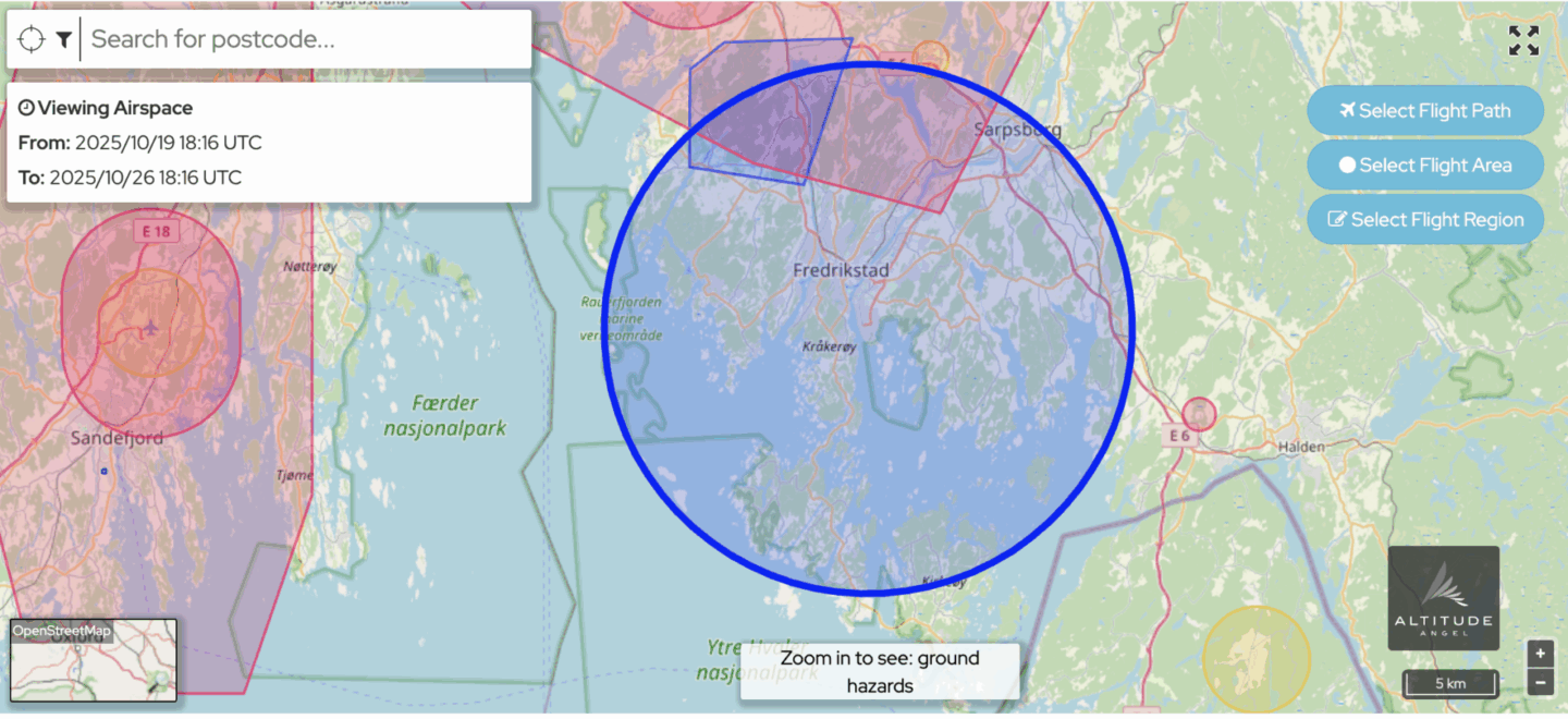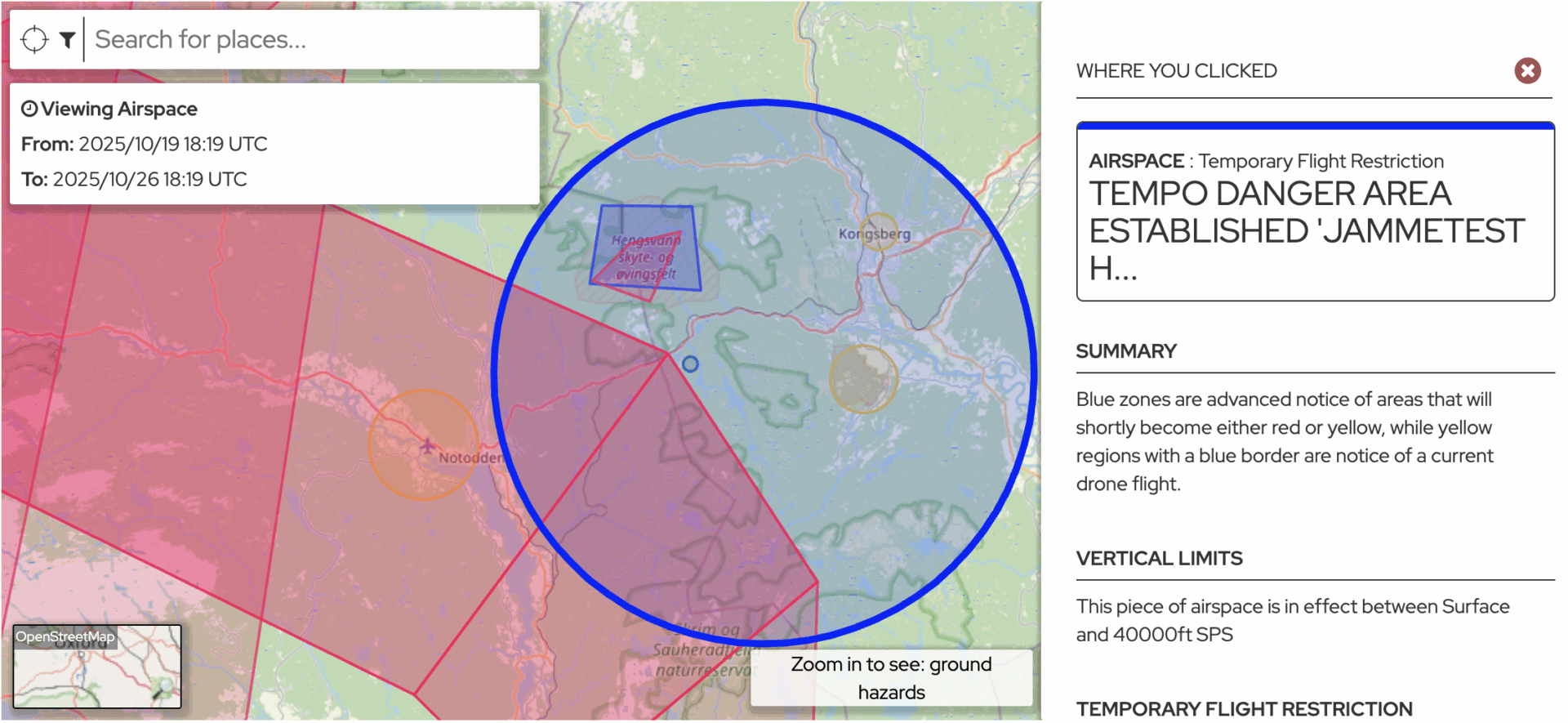 Begge restriksjonsområdene har en radius på 8 nautiske mil, 14,8 kilometer, gjelder opp til 40.000 fot og er ennå ikke synlige som Notam på ippc.no. Derimot har dronepiloter fått et forhåndsvarsel i Avinors droneportal Ninox, der disse to områdene har vært synlige siden torsdag.