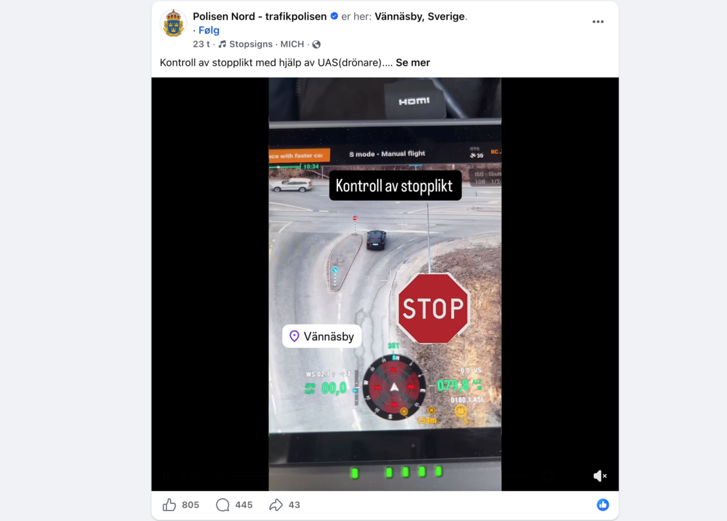 Teksten i politiets innlegg var av det formelle slaget: «Kontroll av stopplikt ved hjelp av UAS (drone). Bestemmelser for trafikk med kjøretøy § 19: En fører som har stopplikt eller skal stanse på grunn av trafikksignal, skal stanse ved stopplinje…. Bot: 2500 kroner dersom man ikke har overholdt stopplikten.»