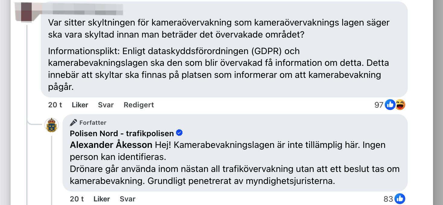 «Hei! Kameraovervåkningsloven kommer ikke til anvendelse her. Ingen person kan identifiseres. Droner kan brukes innenfor nesten all trafikkovervåkning uten at det treffes vedtak om kameraovervåkning. Dette er grundig gjennomgått av myndighetenes jurister.»