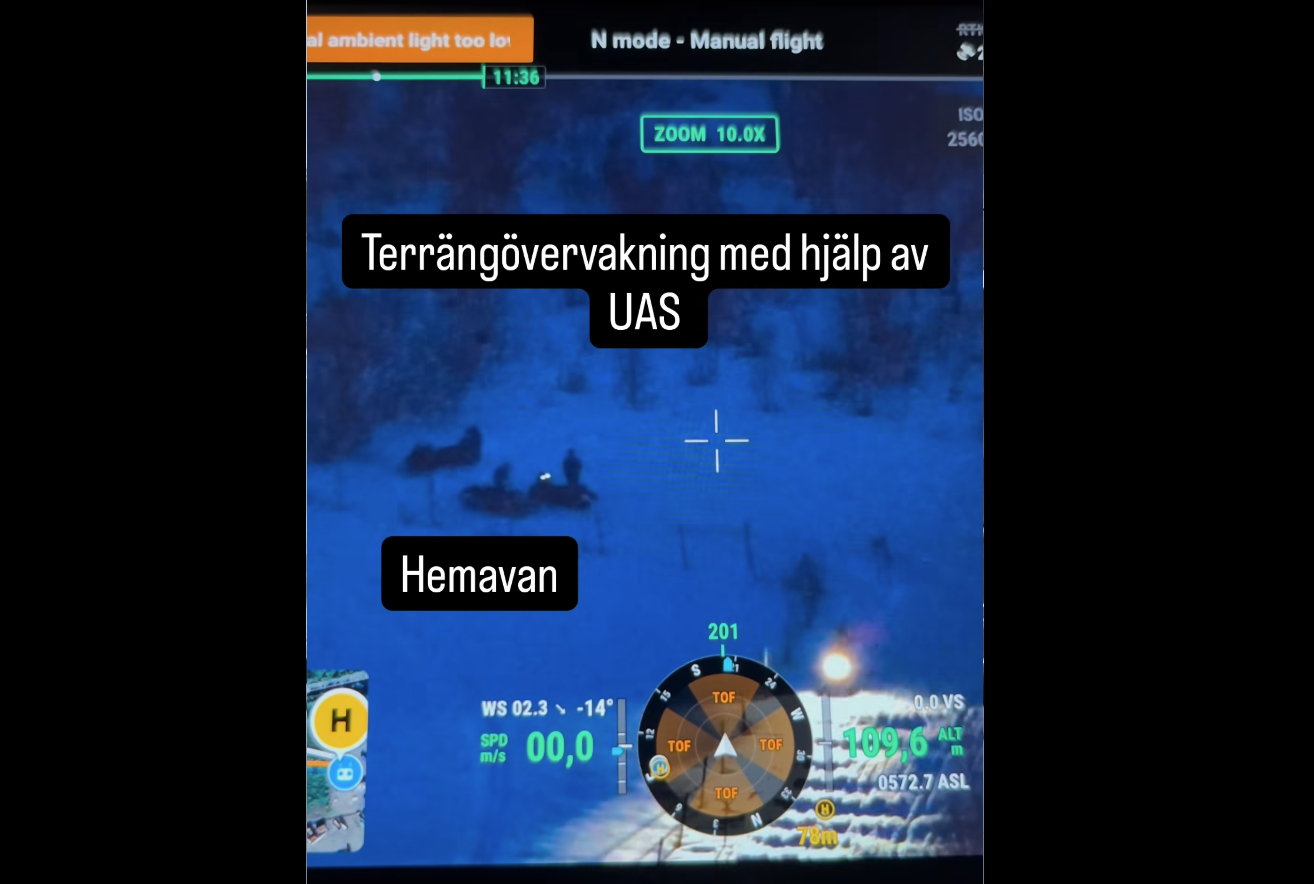 Politiet i Nord-Sverige bruker drone også til overvåking av trafikken med snøscootere ute i fjellområdene, også i den mørke årstiden.